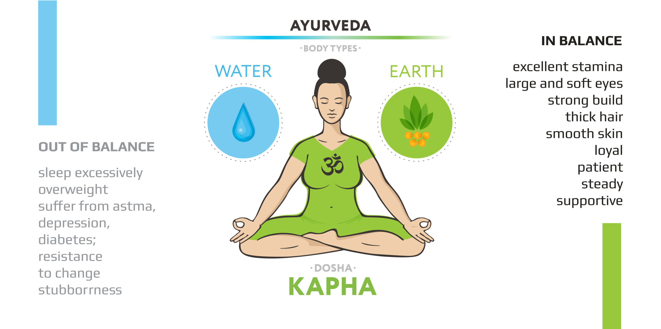 Kapha governs the structure of the body. The Kapha dosha or Energy of Lubrication is derived from earth and water elements. It is the principal that holds the cells together which forms the muscle, fat and bones in the body. Kapha people are usually warm, loving and thoughtful people. But when their kapha goes out of balance, they can become quite stubborn, unreasonable & fearful.
