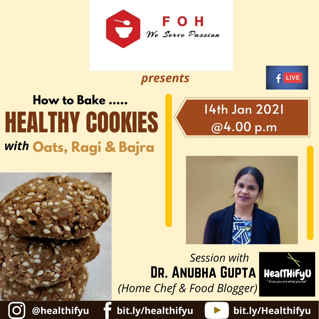 A face book live session on “Healthy Cookies” was conducted in collaboration with a Facebook Group named as FOH that has 18K members. The session was a part of 21 days fitness challenge program conducted by FOH. Three types of cookies were demonstrated- Oats Almonds Cookies, Ragi Coconut Cookies & Bajra-seasame cookies so as to emphasise upon the importance of fiber during dieting. The session was a huge success. More than 100 participants from all over the country participated in the session.
