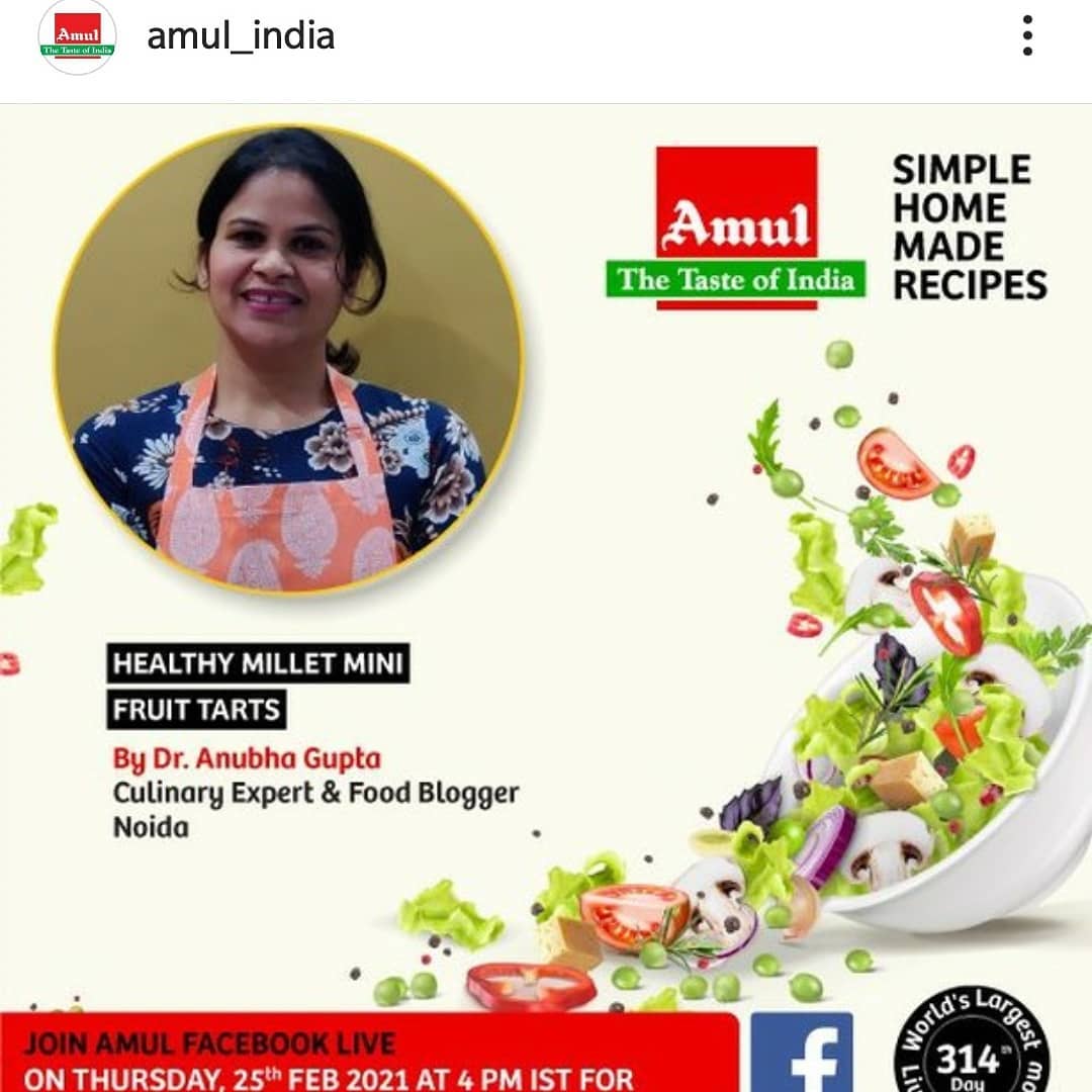 A session was conducted with Amul on Millet Tarts with fruit fillings. The tart was created from Sorghum Flour using Amul’s unsalted butter and was filled with yoghurt. The yoghurt was made from Amul’s dahi. Pineapple & strawberry were used for flavours & colours& no artificial flavours or colors were used.This session aimed at creating a Kids friendly recipe especially those who are fussy eaters.