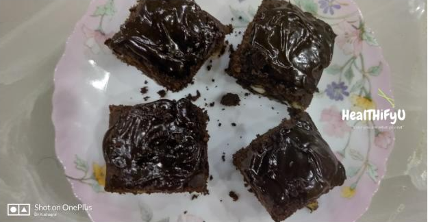 9. Demould the brownie cake & ice it with peanut ganache, cut into pieces & enjoy.
